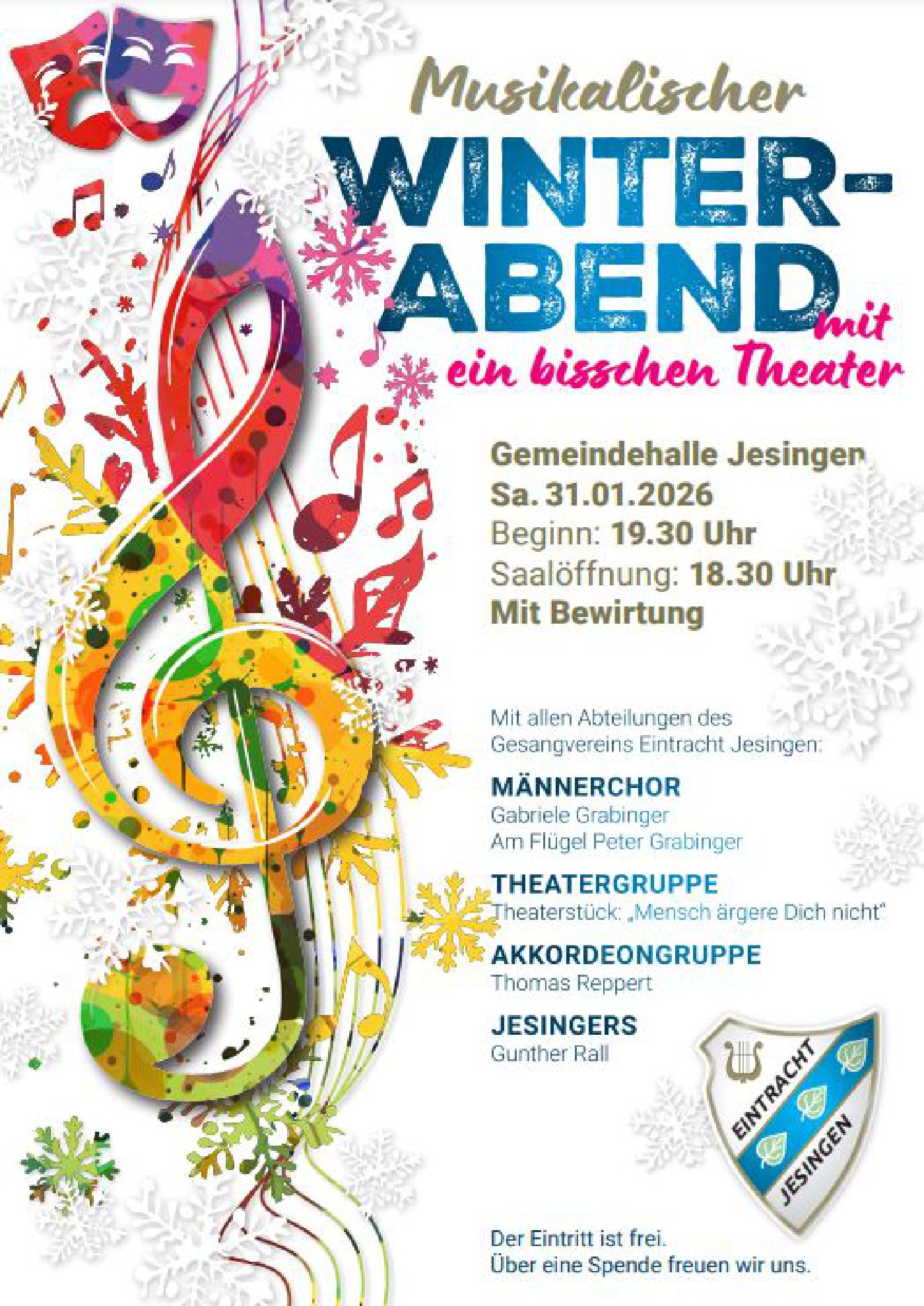 Wir laden Sie herzlich zu unserm musikalischen Winterabend in die Gemeindehalle nach Jesingen ein.